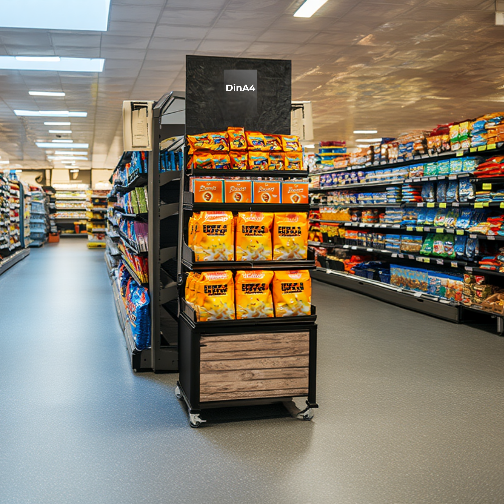 Mobiler Verkaufsständer Concept Trockensortiment ideal für Frequenzpunkte, Aktionsware, Saisonartikel und auffällige Zweitplatzierungen. Marketing per Handgriff austauschbar. Stahlmantel 40 cm hoch mit verstecktem Stauraum im Sockel direkt am POS. Mit 4 geraden Stahlböden (2x 60x40 cm, 2x 60x30 cm) inkl. Marketing Schiefer / Holz. Gesamthöhe: 180 cm. Hinweis: Die aufgeführten Stahlböden/Stahlwannen sind auch kompatibel mit unseren Mobilen Metall Verkaufsständern Variant.